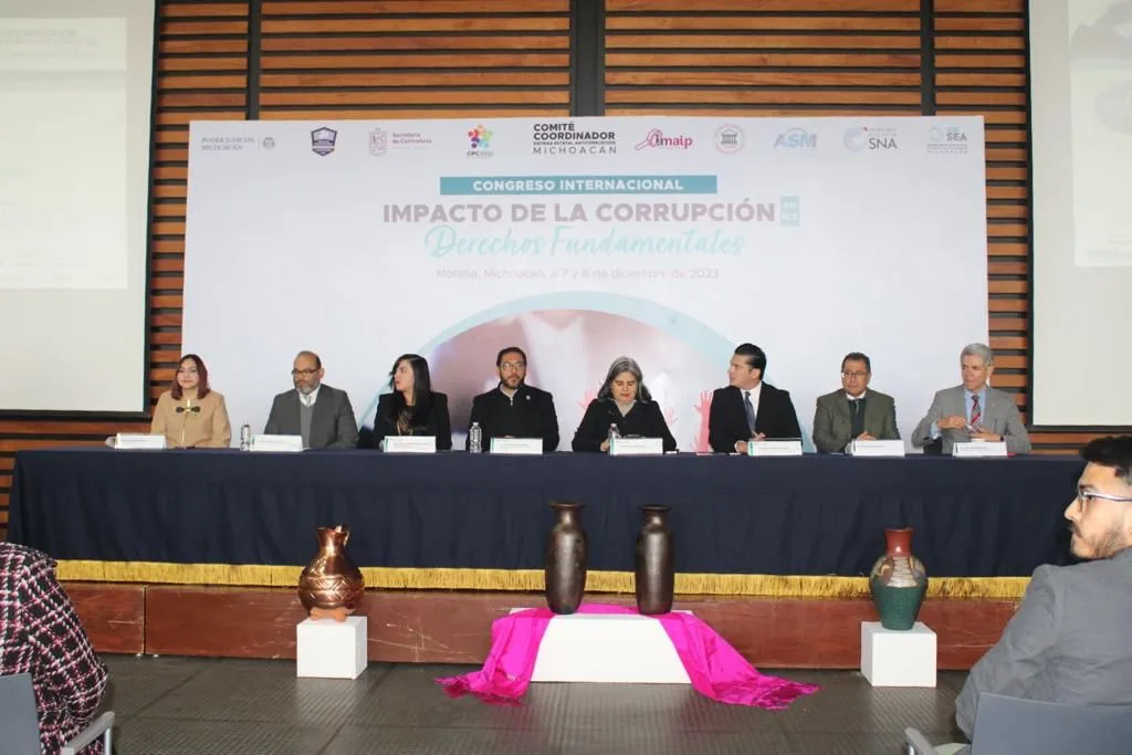 Morelia Michoacán, 8 de diciembre de 2023.- Durante la inauguración del Congreso Internacional Impacto de la Corrupción en los Derechos Fundamentales, realizado por el Sistema Estatal Anticorrupción, la titular de la Contraloría del Estado Azucena Marín, en representación del gobernador Alfredo Ramírez Bedolla, destacó el trabajo que el Sistema Anticorrupción ha impulsado en Michoacán, con avances estratégicos en la prevención y combate a la corrupción.