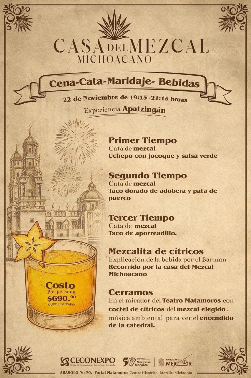 El Centro de Convenciones y Exposiciones de Morelia (Ceconexpo) anunció la realización de un evento denominado Cena–Cata–Maridaje en la Casa del Mezcal Michoacano. El objetivo es ofrecer una degustación especializada de mezcales artesanales del estado, armonizada con gastronomía regional, según informó la dependencia.