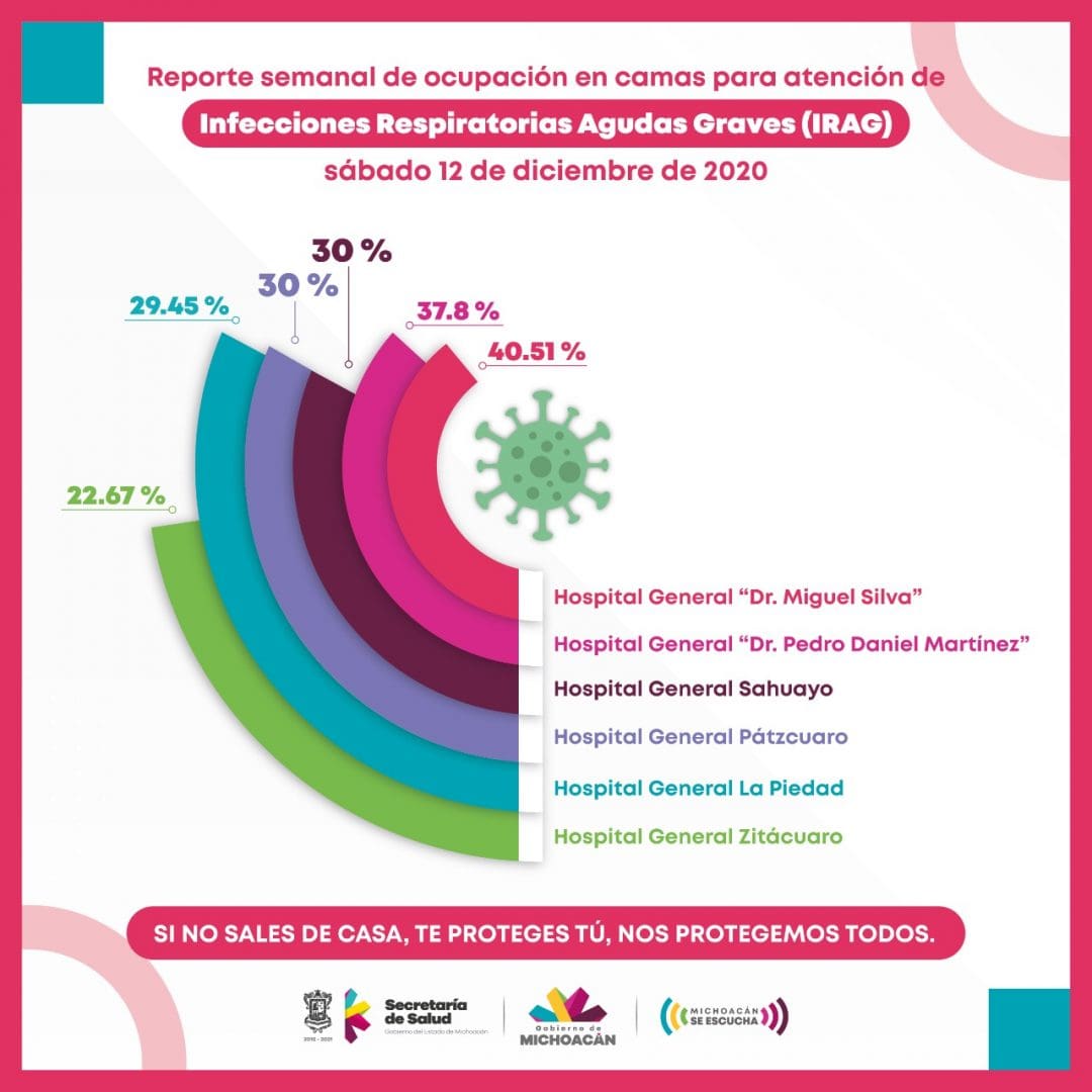 Morelia, Michoacán, a 12 de diciembre de 2020.- La Secretaría de Salud de Michoacán (SSM), da a conocer las unidades médicas que registran mayor ocupación hospitalaria de camas reconvertidas para la atención de Infecciones Respiratorias Agudas Graves (IRAG).