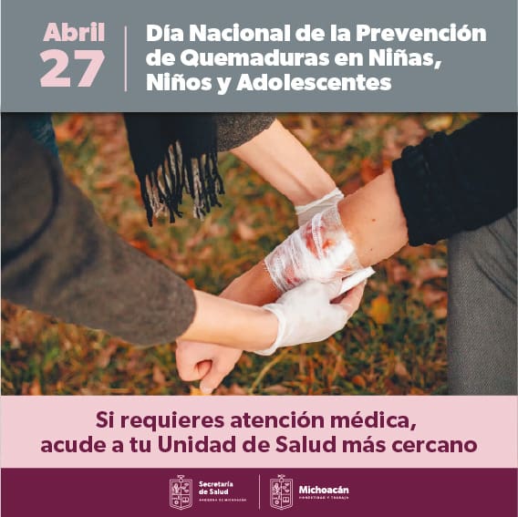 Morelia, Michoacán, 27 de abril de 2023.- En el marco del Día Nacional de la Prevención de Quemaduras en Niñas, Niños y Adolescentes, que se conmemora cada 27 de abril, la Secretaría de Salud de Michoacán (SSM) exhorta a padres y madres de familia a extremar precauciones en el hogar, para evitar accidentes relacionados con el uso de fuego.