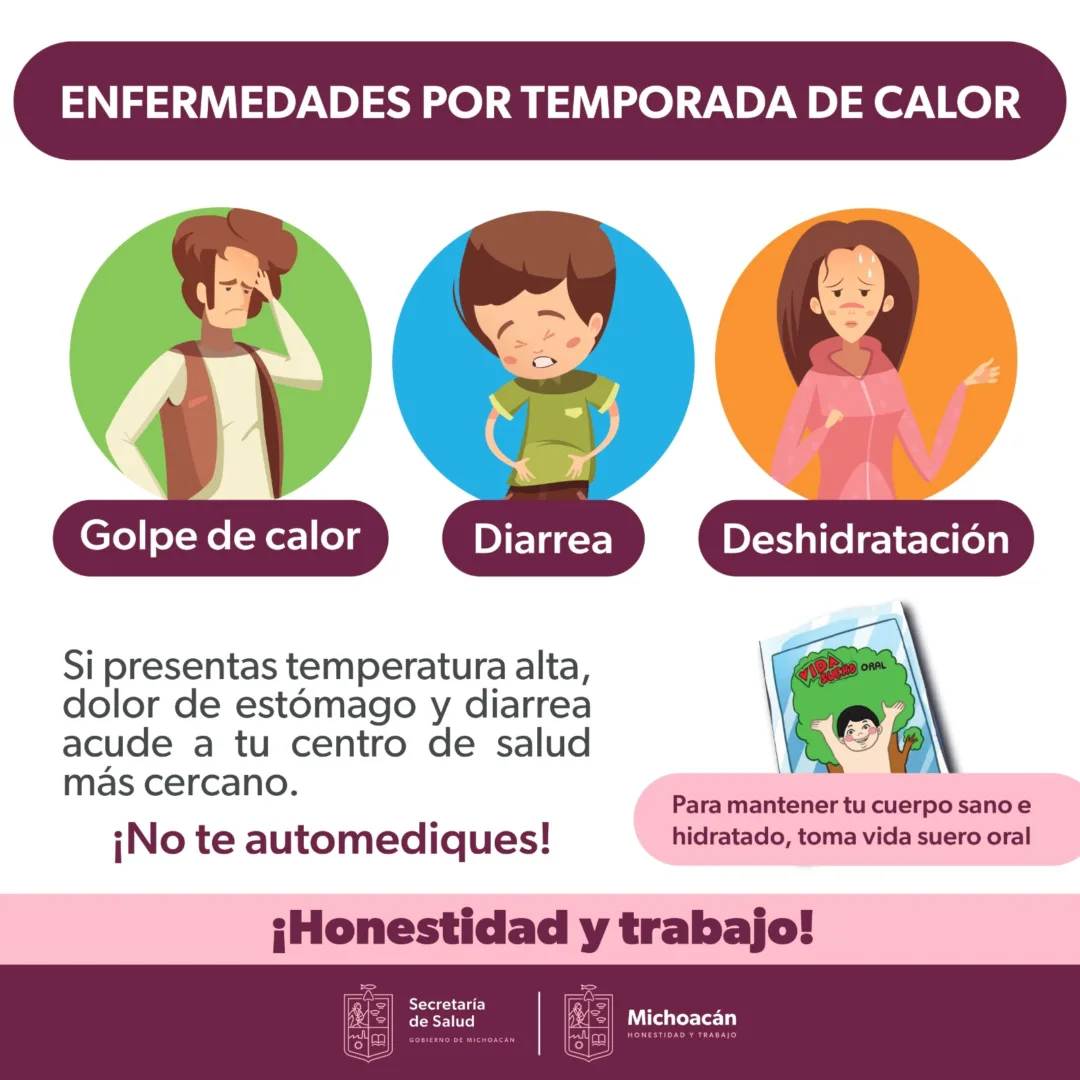 Morelia, Michoacán, 11 de marzo de 2023.- La Secretaría de Salud de Michoacán (SSM), exhorta a madres de familia a estar alertas ante síntomas como irritabilidad, agotamiento, piel caliente (temperatura corporal entre los 39 y 40 grados), respiración agitada, piel enrojecida y deshidratación, porque los infantes pueden estar presentando un golpe de calor.
