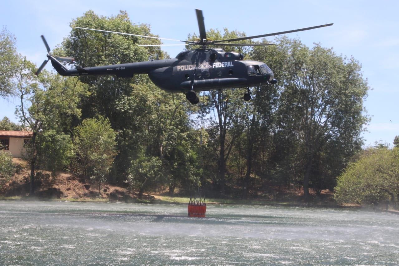 El helicóptero ya está trabajando para apoyar a los combatientes de a pie en conflagraciones activas registradas en la comunidad indígena de San Francisco y Capacuaro, donde se dificulta el ingreso de los brigadistas debido a que se ubican en un terreno volcánico de acceso complicado, conocido como malpaís.