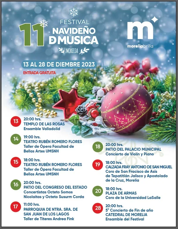 Morelia, Michoacán; 06 de diciembre del 2023. En el marco de la temporada festiva, el Gobierno Municipal de Morelia, encabezado por el Presidente Alfonso Martínez Alcázar, ya está listo para llevar a cabo la décima primera edición del Festival Navideño de Música.