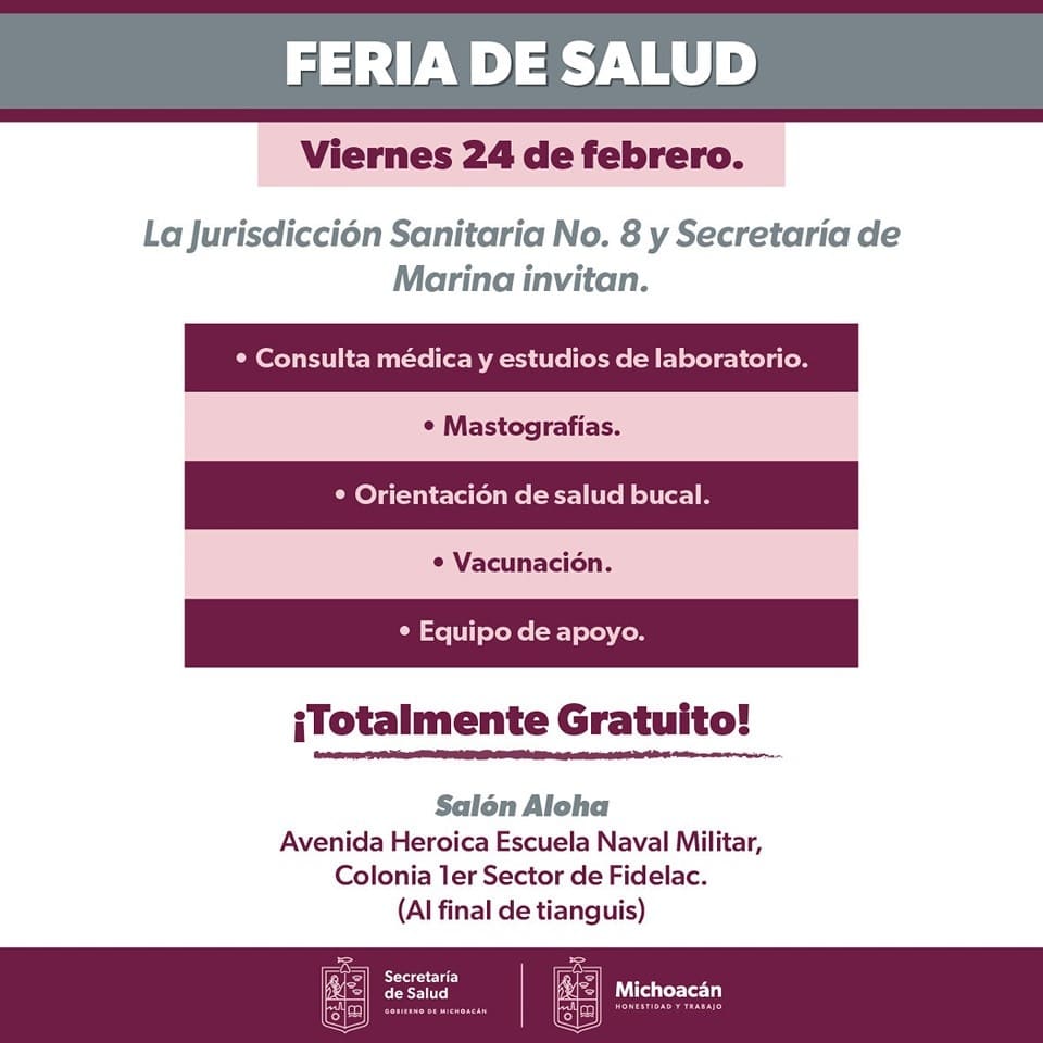 Morelia, Michoacán, 24 de febrero de 2023.- La Secretaría de Salud de Michoacán (SSM) invita a la población de Lázaro Cárdenas a la Feria de la Salud que se realizará este viernes 24 de febrero, en el salón Aloha.