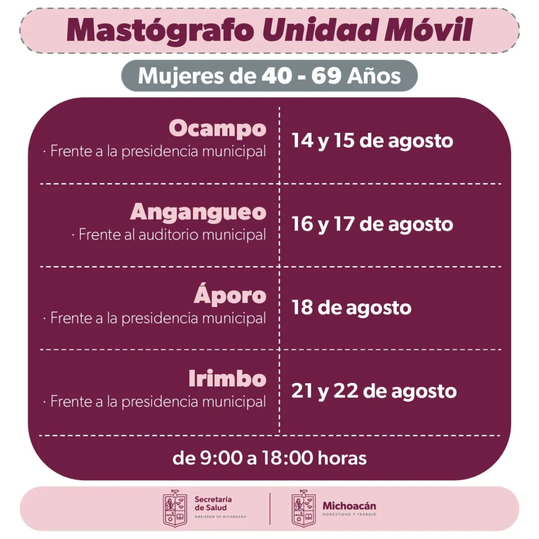 En Áporo, las mastografías se ofrecerán en la plaza ubicada frente a la presidencia municipal el viernes 18 de agosto y las citas pueden agendarse en el centro de salud. La última jornada está programada para el 21 y 22 de agosto frente al palacio municipal.
