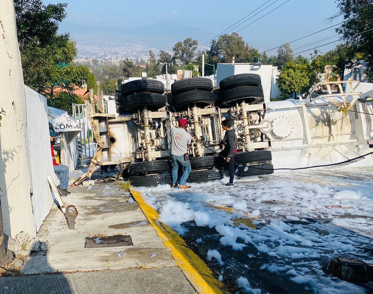 Morelia, Michoacán, a 26 de noviembre de 2021.- El Gobierno de Morelia a través de la Policía Morelia, Protección Civil y Bomberos Municipales, continúan con tareas en las inmediaciones del fraccionamiento Loma de la Floresta, donde esta mañana volcó una pipa que transportaba combustible.