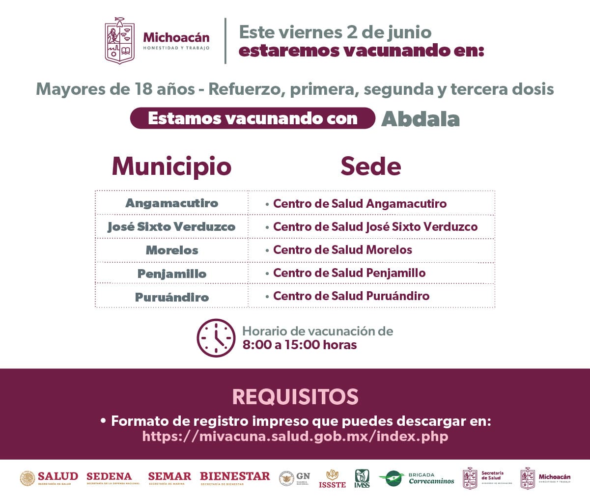 Morelia, Michoacán, 2 de junio de 2023.- La Secretaría de Salud de Michoacán (SSM) mantendrá activos durante este mes sus módulos de vacunación contra el COVID-19 en los municipios de La Piedad, Churintzio, Puruándiro, Tlazazalca, Tanhuato, Yurécuaro, Numarán, José Sixto Verduzco, Angamacutiro, Morelos y Penjamillo, los cuales funcionarán de 08:30 a 16:00 horas.
