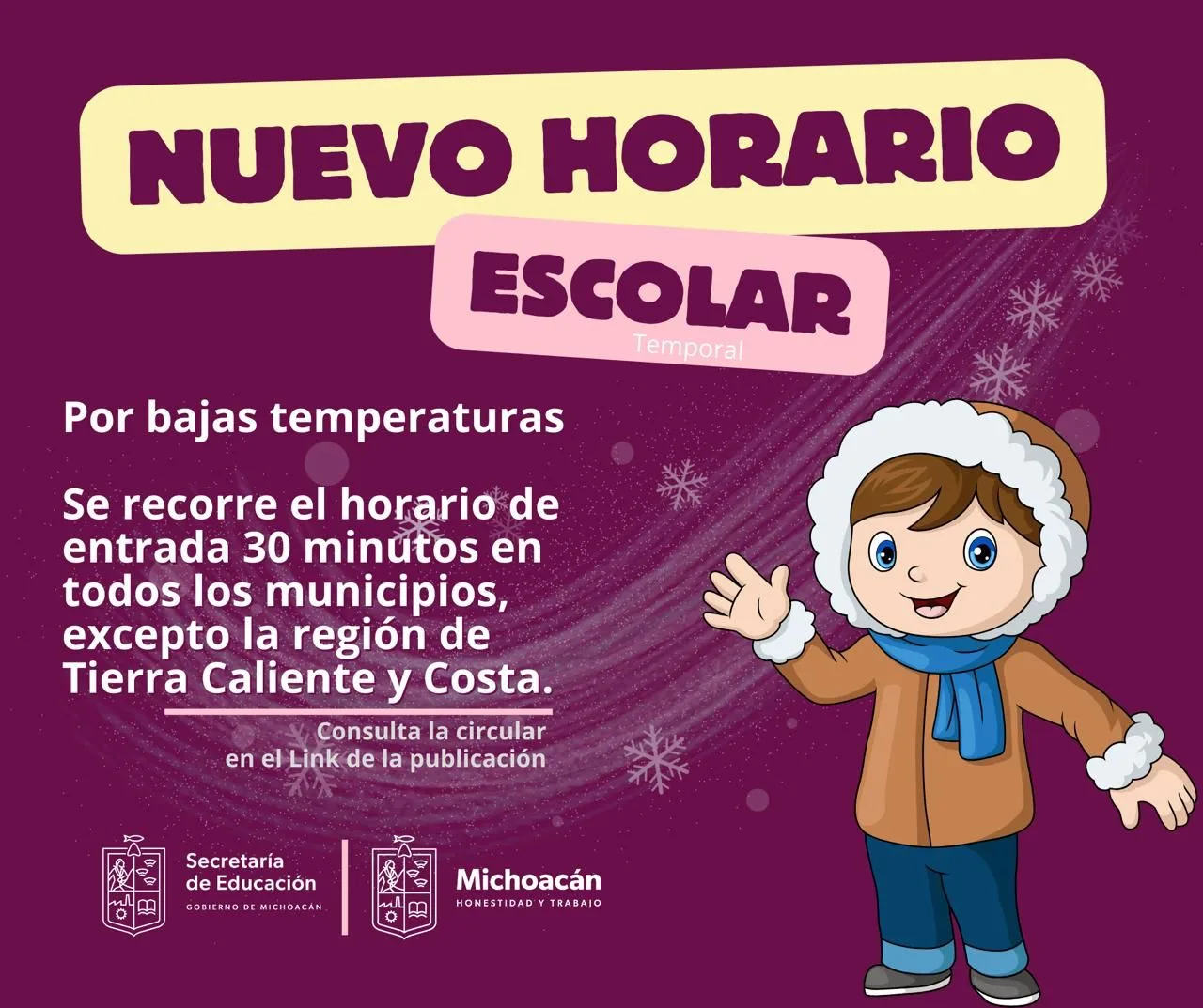 Morelia, Michoacán, 12 de diciembre de 2023.- Para cuidar la salud y el bienestar de niñas, niños y adolescentes, en Michoacán más de 7 mil escuelas de nivel básico ajustaron su horario para entrar media hora más tarde durante la época invernal, informó la Secretaría de Educación del Estado (SEE).