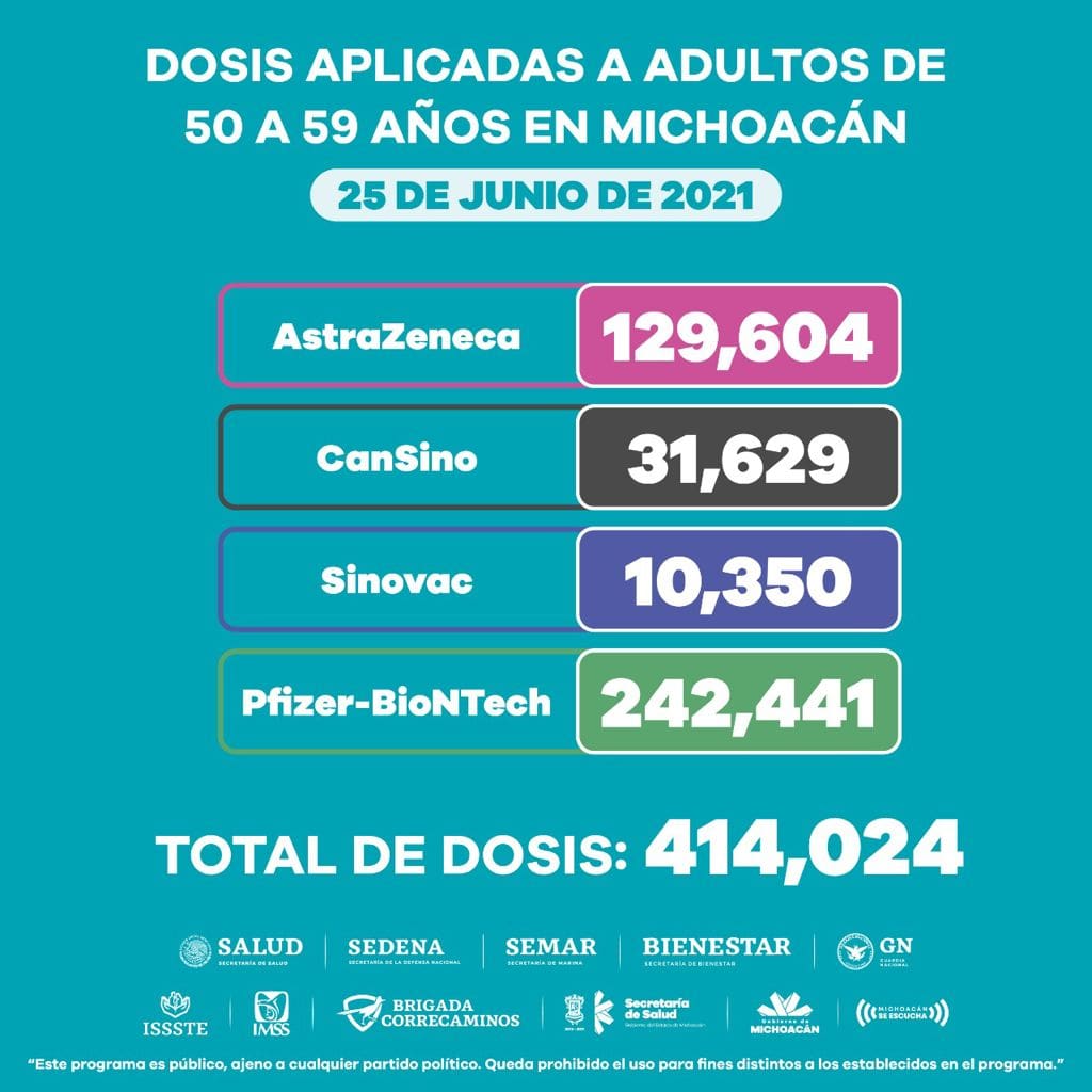 Morelia, Michoacán, a 25 de junio de 2021.- En la entidad se han aplicado un millón 117 mil 943 dosis de vacuna contra COVID-19 a personas mayores de 50 años.