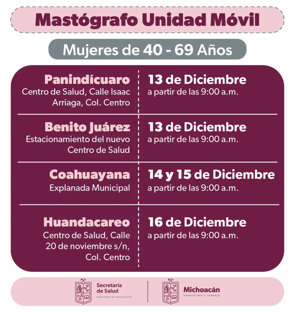 En Coahuayana, las mastografías se harán del 14 al 15 de diciembre en la explanada municipal desde las 09:00 hasta las 17:00 horas; mientras que en Huandacareo la jornada tendrá lugar el viernes 16 en el centro de salud ubicado en la calle 20 de noviembre S/N de la colonia Centro.