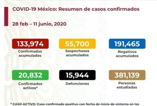 Se registran 15 mil 944 defunciones, 133 mil 974 casos confirmados, 20 mil 832 casos activos, 55 mil 700 casos sospechosos, 191 mil 465 casos negativos y 381 mil 139 personas estudiadas por Covid-19 en México.