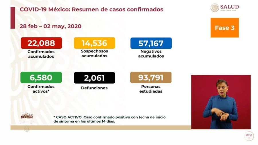 El subsecretario de Salud en México Hugo López-Gatell, informó que el total de casos confirmados en #México, hasta el momento, es de 22, 088 , con 6, 580 casos activos y 2,061 defunciones.
