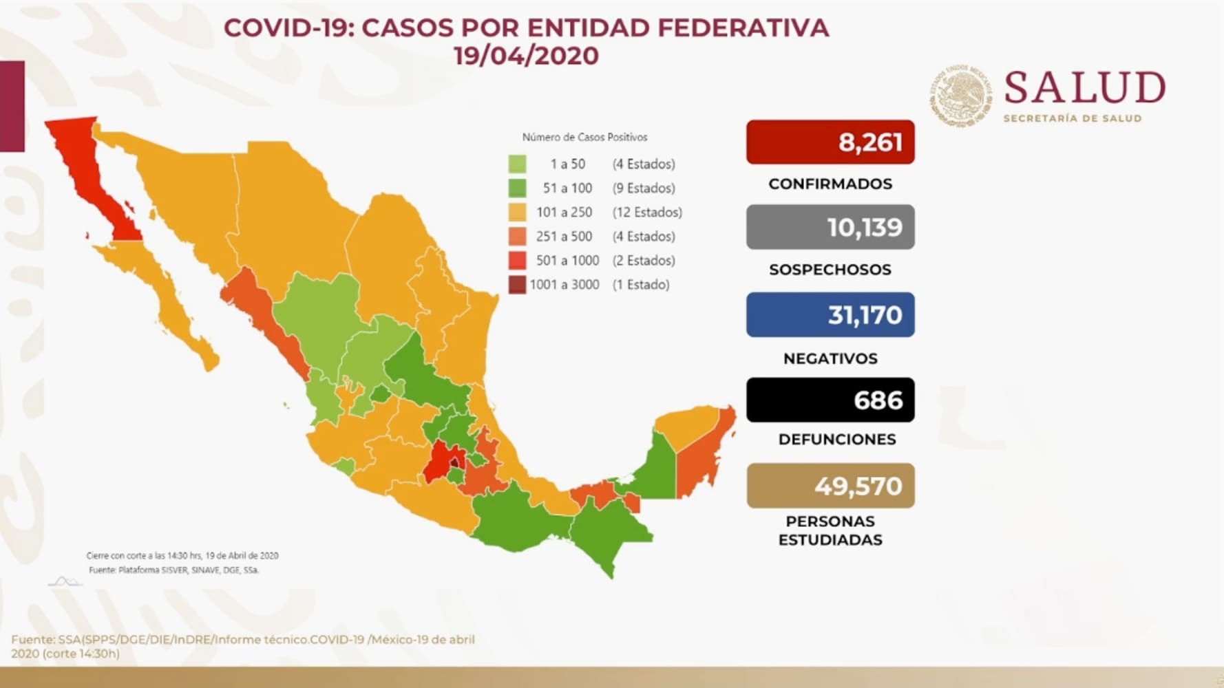 Panorama en México 19 de abril 2020: 8,261 casos confirmados, 10,139 sospechosos, 31,170 negativos y 686 defunciones. Se ha estudiado a 49,570 personas. De casos confirmados, 5,212 (63.09%) han sido leves y 3,049 (36.91%) han requerido hospitalización por #COVID19.