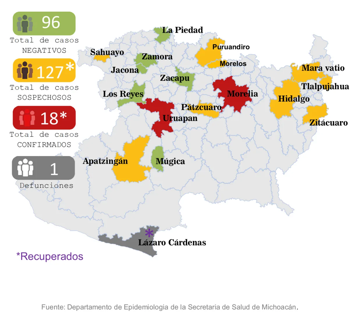 Hasta el momento: 18 casos se han confirmado en el Estado de Michoacán, CATORCE en Morelia TRES en Lázaro Cárdenas UNO Uruapan.