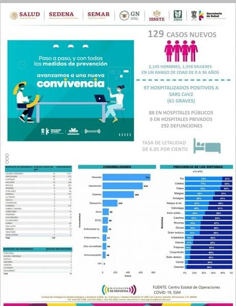 Zitácuaro Michoacán. El Comité Estatal de Seguridad en Salud reportó que al día de hoy 292 personas han muerto en Michoacán por COVID-19 y reporta 3,703 casos acumulados con reporte positivo de Coronavirus en diferentes municipios, esto es 129 casos nuevos en menos de 24 horas, entre los municipios más afectados se encuentran: LÁZARO CÁRDENAS, MORELIA, APATZINGÁN, URUAPAN, MÚGICA Y ZITÁCUARO.