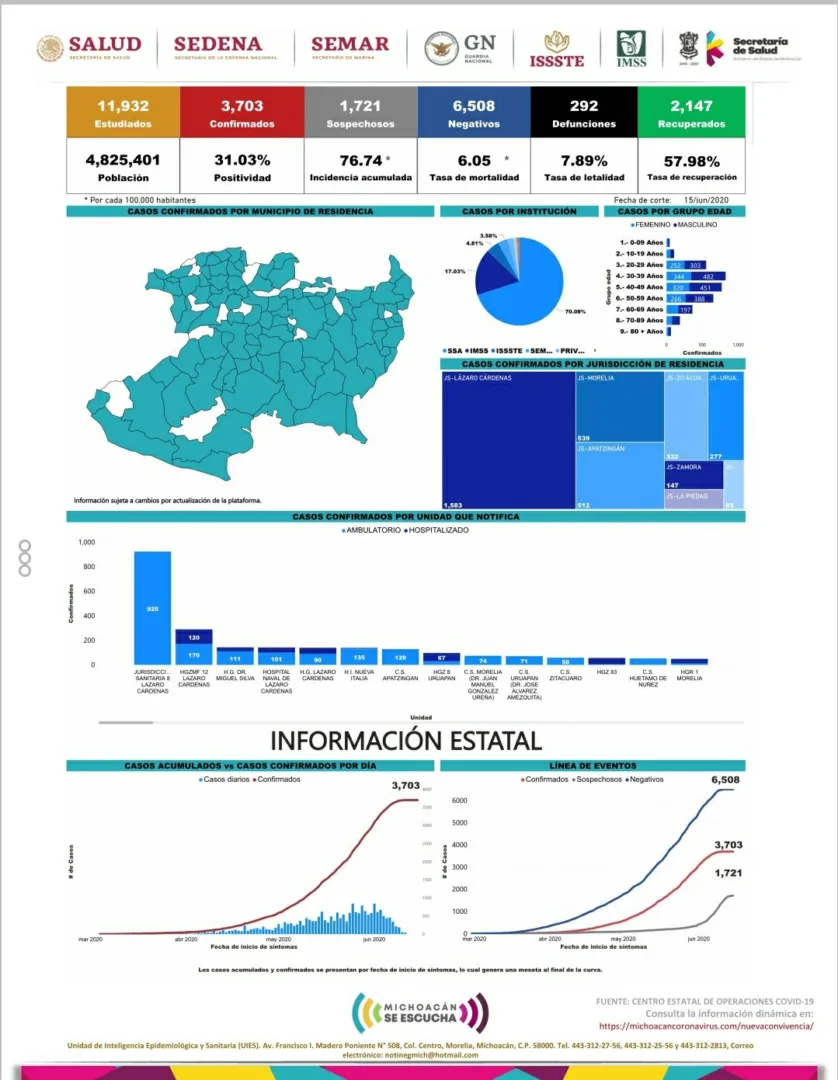 Michoacán acumula 292 muertos y 3,703 casos positivos por COVID-19