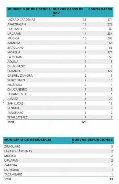 *- Michoacán reporto hoy 13 muertos por COVID-19 y 129 casos positivos en las últimas 24 horas.