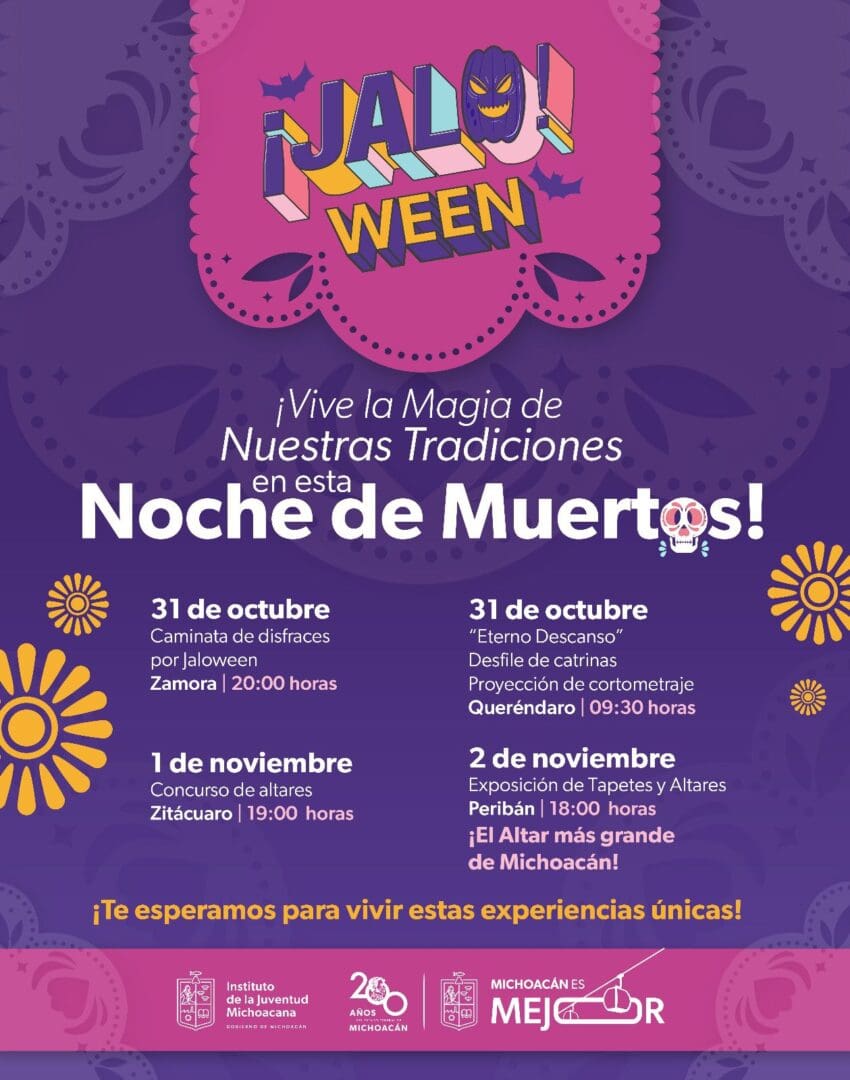 El director del Ijumich destacó la importancia de estas actividades para fomentar el orgullo y la conexión de las nuevas generaciones con sus raíces culturales. “Jalo Ween 2024” se llevará a cabo del 31 de octubre al 2 de noviembre en los municipios de Zamora, Queréndaro, Zitácuaro y Peribán.