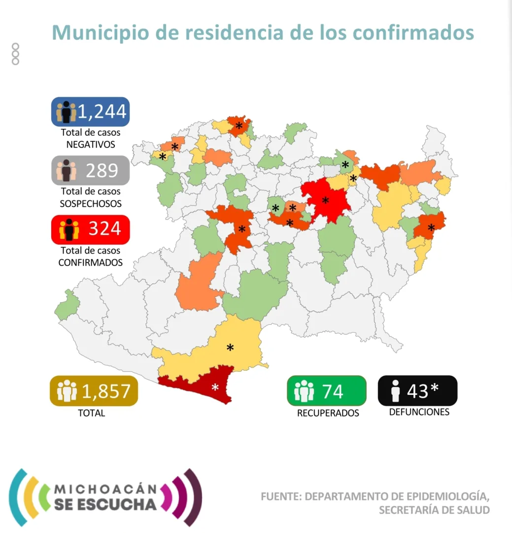 El Comité Estatal de Seguridad en Salud reportó que al día de hoy 43 personas han muerto en Michoacán por COVID-19 y reporta 324 casos confirmados en diferentes municipios, entre los municipios más afectados se encuentran: