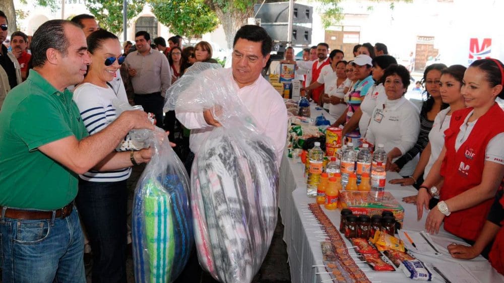 Morelia, Michoacán.- Michoacán está de pie y recuperándose, aseguró Jesús Reyna García, gobernador del estado, quien acompañado de su esposa e hijas, hizo entrega de diversos apoyos en especie, como cobijas y enseres domésticos, al Centro de Acopio ubicado en la Plaza Jardín Morelos, en beneficio de la población afectada por las contingencias ambientales.