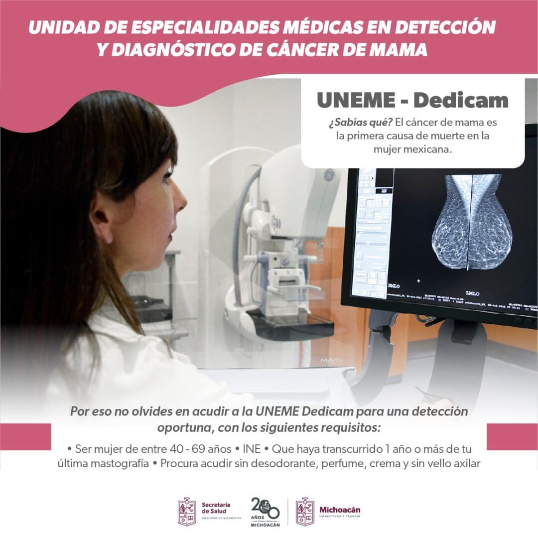 La Unidad de Especialidades Médicas Dedicada a la Detección del Cáncer de Mama (Uneme Dedicam), de la Secretaría de Salud de Michoacán (SSM), proporciona servicios gratuitos de detección y diagnóstico de cáncer de mama.