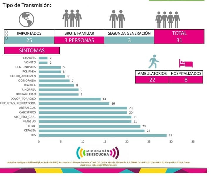 • Hasta el momento: 31 casos se han confirmado en el Estado de Michoacán, DIECINUEVE en Morelia, UNO en Zamora,