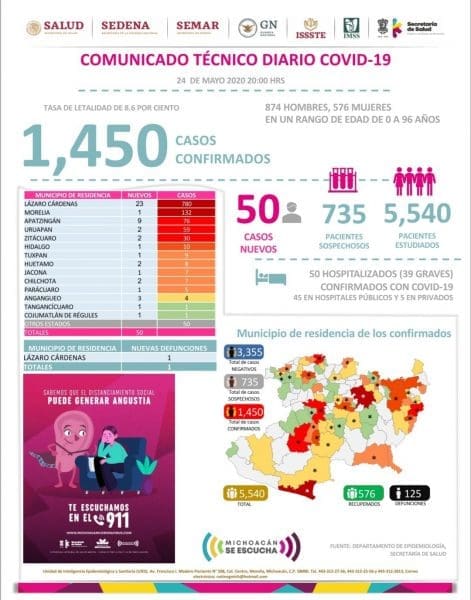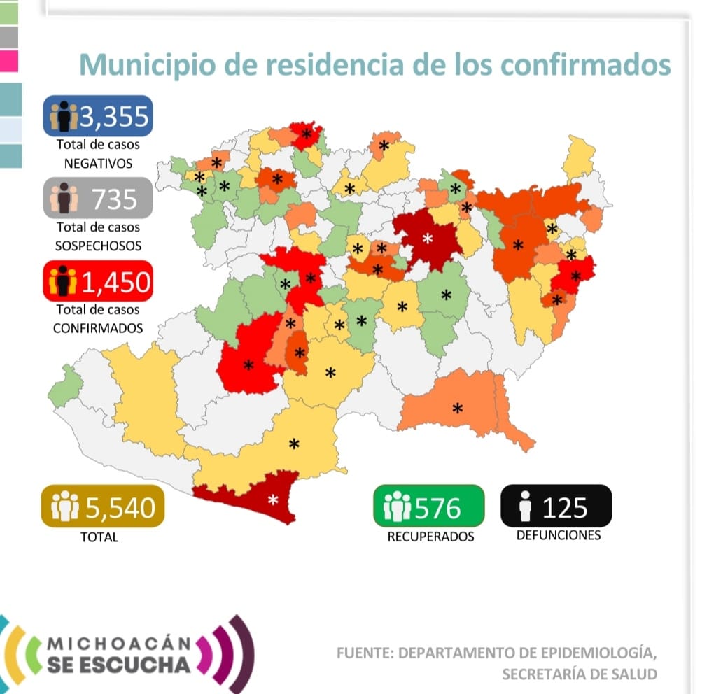 Zitácuaro Michoacán. El Comité Estatal de Seguridad en Salud reportó que al día de hoy 125 personas han muerto en Michoacán por COVID-19 y reporta 1,450 casos acumulados con reporte positivo de Coronavirus en diferentes municipios, esto es 50 casos nuevos en menos de 24 horas, entre los municipios más afectados se encuentran: ÁZARO CÁRDENAS, MORELIA, APATZINGÁN, URUAPAN Y ZITÁCUARO