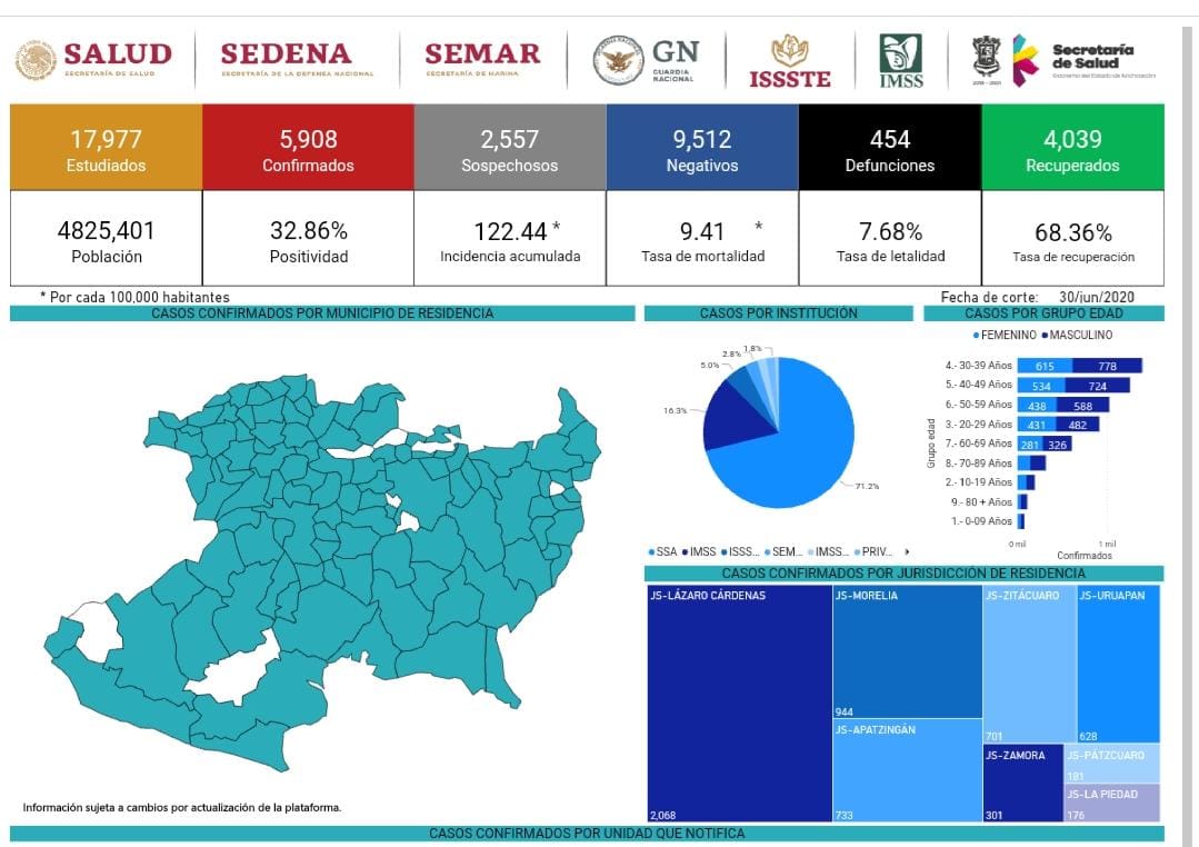 Zitácuaro Michoacán. El Comité Estatal de Seguridad en Salud reportó que al día de hoy 454 personas han muerto en Michoacán por COVID-19 y registra 5908 casos acumulados con reporte positivo de Coronavirus en diferentes municipios, esto es 86 casos nuevos en menos de 24 horas, se reportan hasta el momento que 4039 personas se han recuperado.
