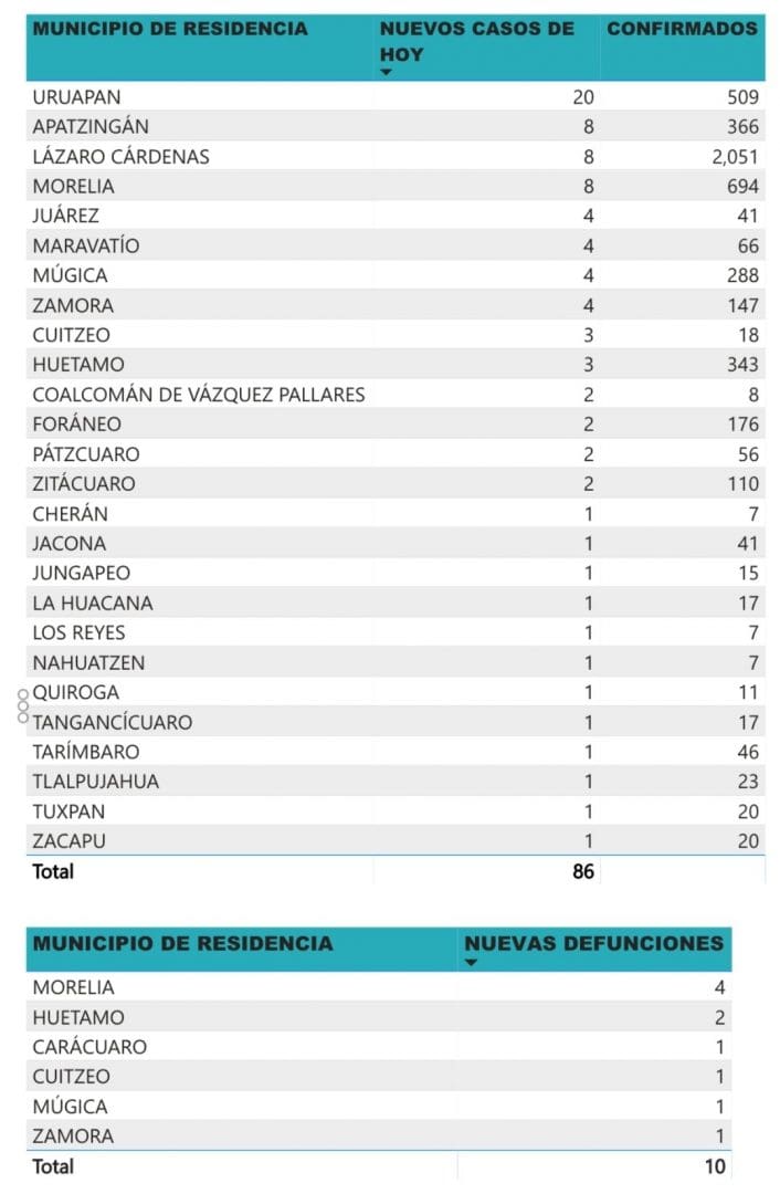 Michoacán reporta 10 muertos y 86 casos nuevos por COVID-19