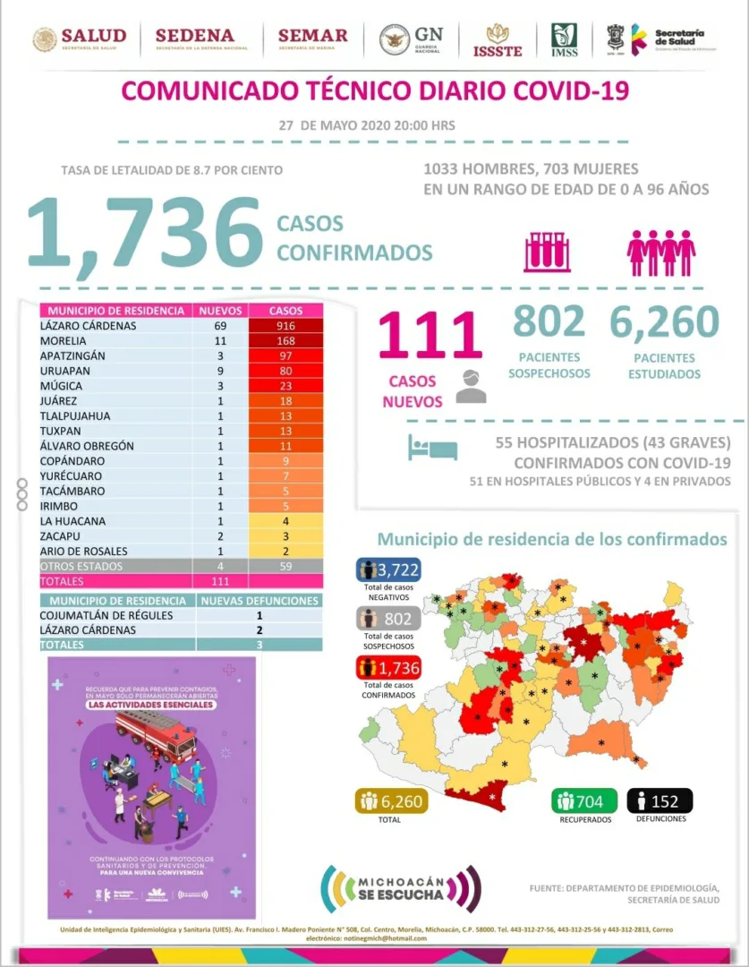 Zitácuaro Michoacán. El Comité Estatal de Seguridad en Salud reportó que al día de hoy 152 personas han muerto en Michoacán por COVID-19 y reporta 1,736 casos acumulados con reporte positivo de Coronavirus en diferentes municipios, esto es 111 casos nuevos en menos de 24 horas, entre los municipios más afectados se encuentran: ÁZARO CÁRDENAS, MORELIA, APATZINGÁN, URUAPAN Y ZITÁCUARO
