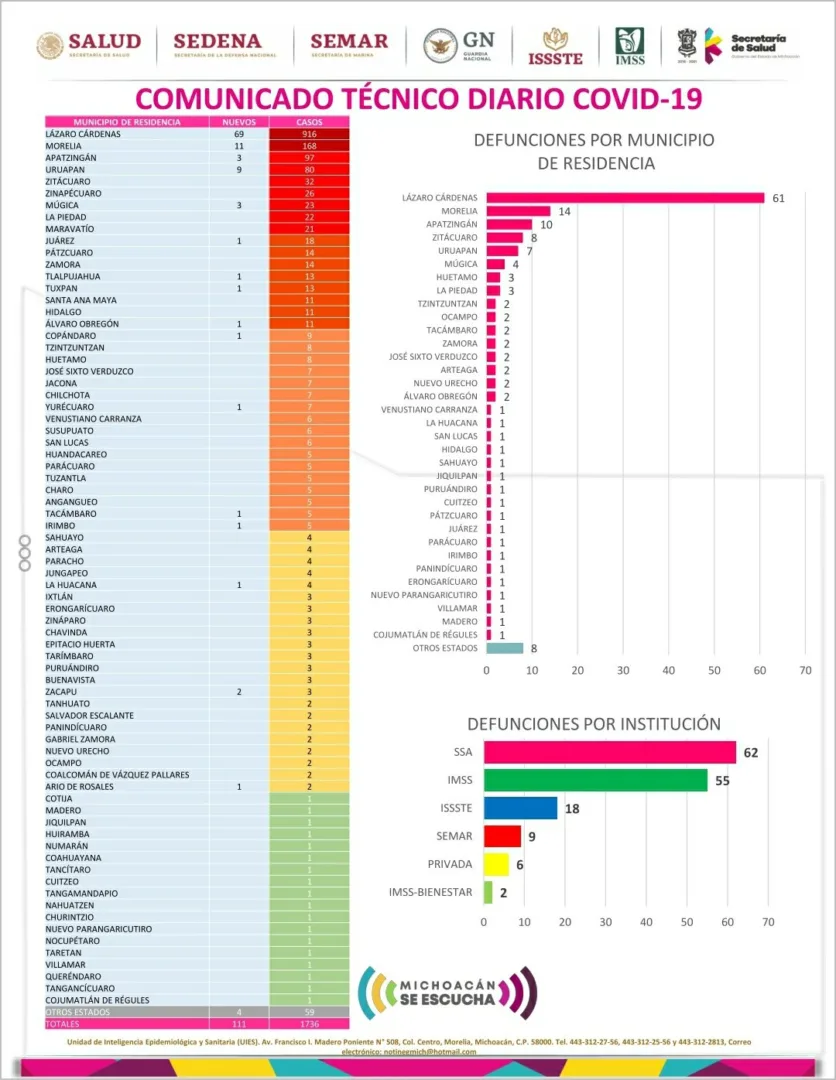 Michoacán reporta 111 casos nuevos por COVID-19, suma 1736 y 152 defunciones.