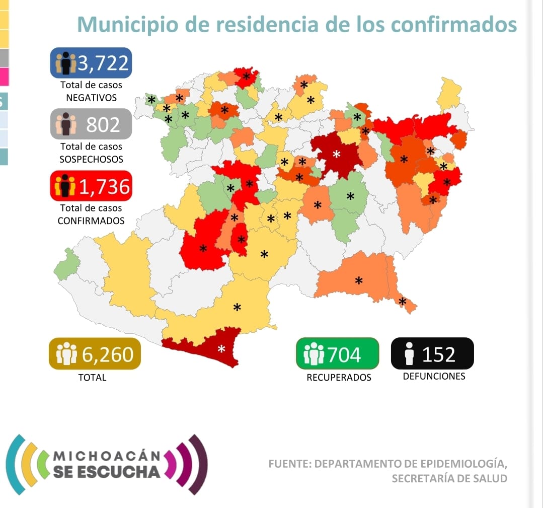 Zitácuaro Michoacán. El Comité Estatal de Seguridad en Salud reportó que al día de hoy 152 personas han muerto en Michoacán por COVID-19 y reporta 1,736 casos acumulados con reporte positivo de Coronavirus en diferentes municipios, esto es 111 casos nuevos en menos de 24 horas, entre los municipios más afectados se encuentran: ÁZARO CÁRDENAS, MORELIA, APATZINGÁN, URUAPAN Y ZITÁCUARO
