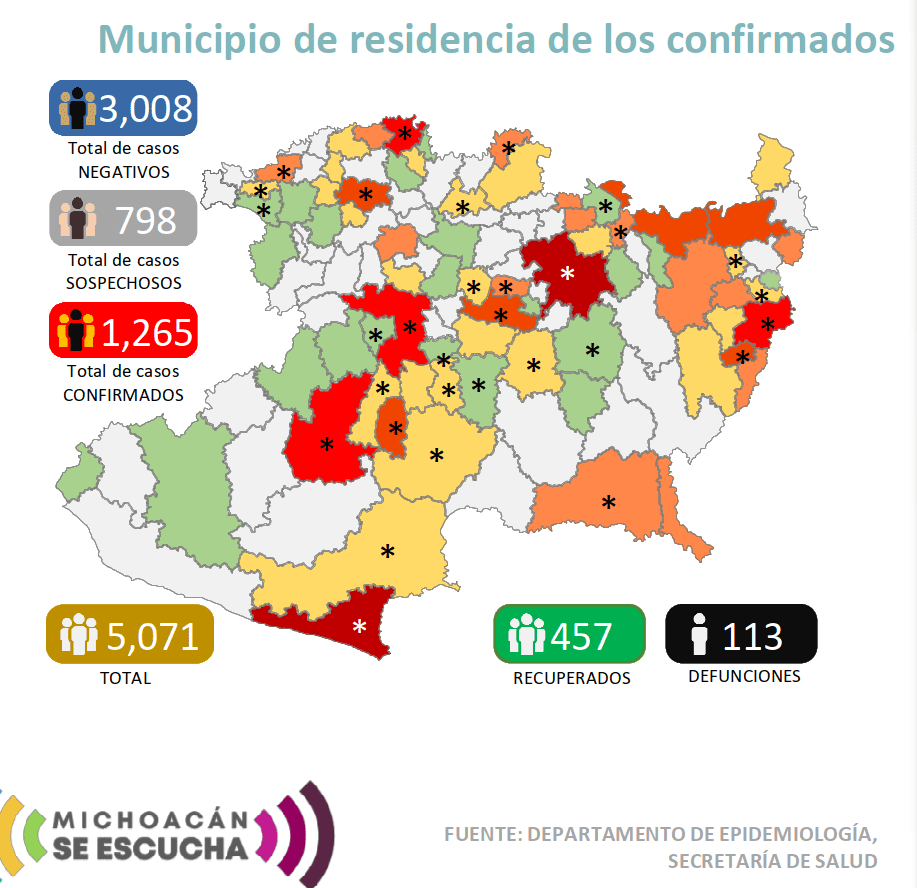 Zitácuaro Michoacán. El Comité Estatal de Seguridad en Salud reportó que al día de hoy 113 personas han muerto en Michoacán por COVID-19 y reporta 1,265 casos acumulados con reporte positivo de Coronavirus en diferentes municipios, esto es 76 casos nuevos en menos de 24 horas, entre los municipios más afectados se encuentran: ÁZARO CÁRDENAS, MORELIA, APATZINGÁN, URUAPAN Y ZITÁCUARO