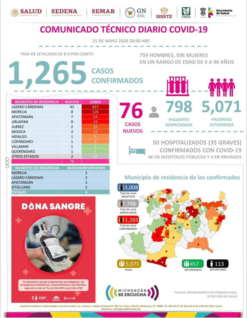¤ Michoacán reportó este día 6 muertes por COVID-19 y 1,265 casos positivos acumulados, esto es 76 casos nuevos en menos de 24 horas.