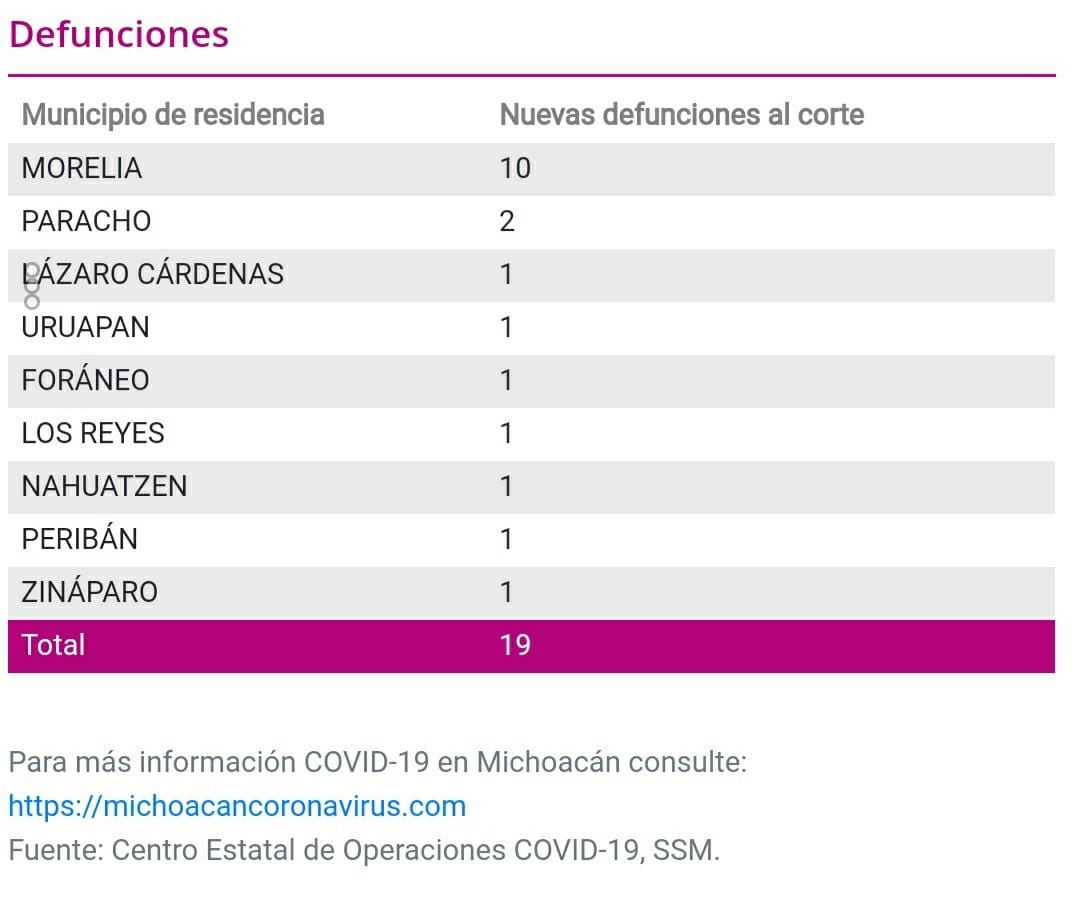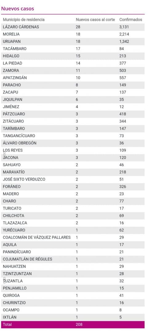 Michoacán reporta 19 muertos y 208 casos positivos a COVID-19