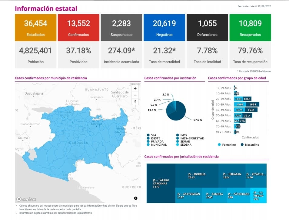 Zitácuaro Michoacán. El Comité Estatal de Seguridad en Salud reportó que al día de hoy 1,055 personas han muerto en Michoacán por COVID-19 y reporta 13,552 casos acumulados con reporte positivo de Coronavirus en diferentes municipios.