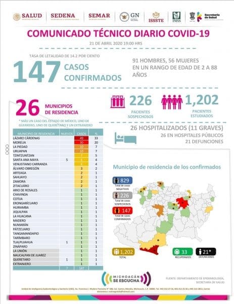 El Comité Estatal de Seguridad en Salud reportó que al día de hoy 21 personas han muerto en Michoacán por COVID-19 y reporta 147 casos confirmados en diferentes municipios, entre los más afectados se encuentran, Lázaro Cárdenas, Morelia, La Piedad y Uruapan, hoy se detecto el primer caso en Tlalpujahua.