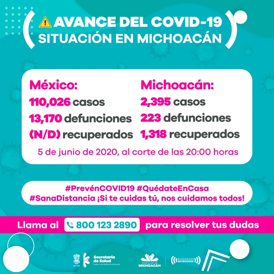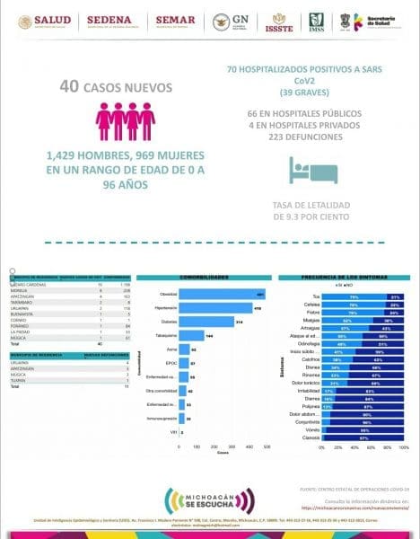Michoacán reporta 2395 casos positivos de COVID19 y 223 muertos .
