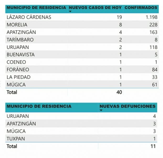 *- Michoacán reportó este día 11 muertos por COVID-19 y 40 casos nuevos en menos de 24 horas.