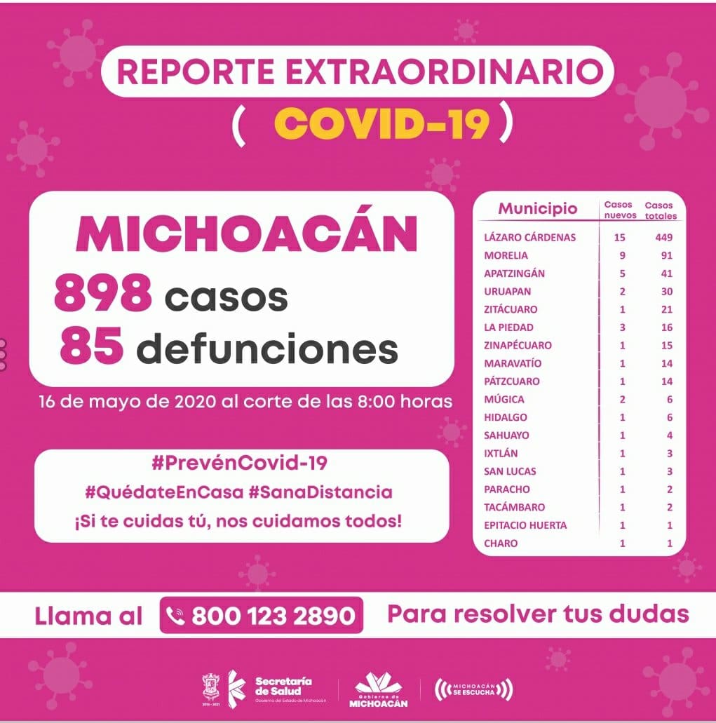 Zitácuaro Michoacán. El Comité Estatal de Seguridad en Salud emitió un reporte extraordinario donde informó que al día de hoy sábado con corte a las 8:00 horas, se registran 898 casos acumulados con reporte positivo por COVID-19 en diferentes municipios, esto es 48 casos nuevos en menos de 24 horas.