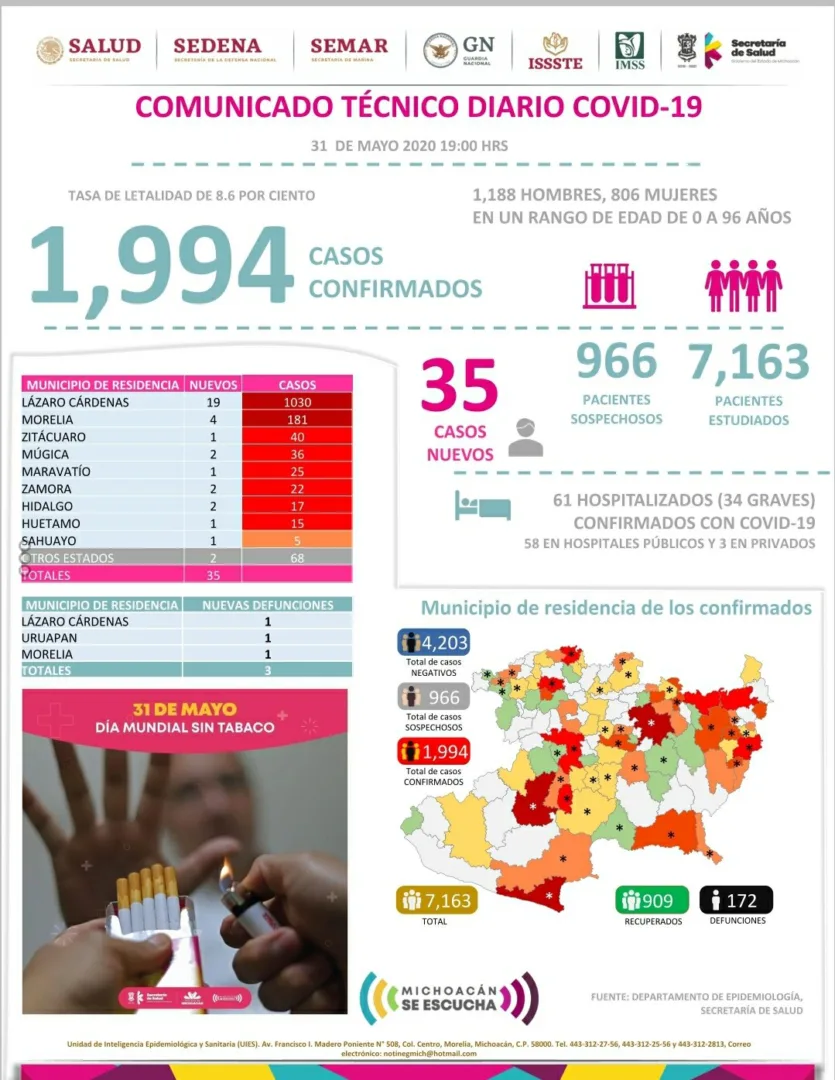 Zitácuaro Michoacán. El Comité Estatal de Seguridad en Salud reportó que al día de hoy 172 personas han muerto en Michoacán por COVID-19 y reporta 1,994 casos acumulados con reporte positivo de Coronavirus en diferentes municipios, esto es 35 casos nuevos en menos de 24 horas, entre los municipios más afectados se encuentran: ÁZARO CÁRDENAS, MORELIA, APATZINGÁN, URUAPAN Y ZITÁCUARO