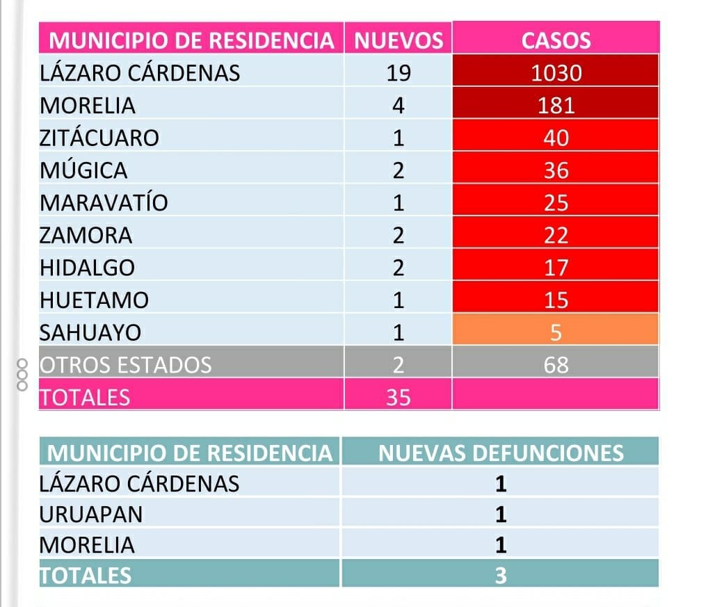 *- Michoacán reportó este día 3 muertos por COVID-19 y 35 casos nuevos en menos de 24 horas.