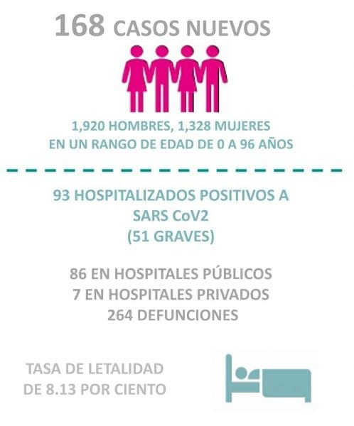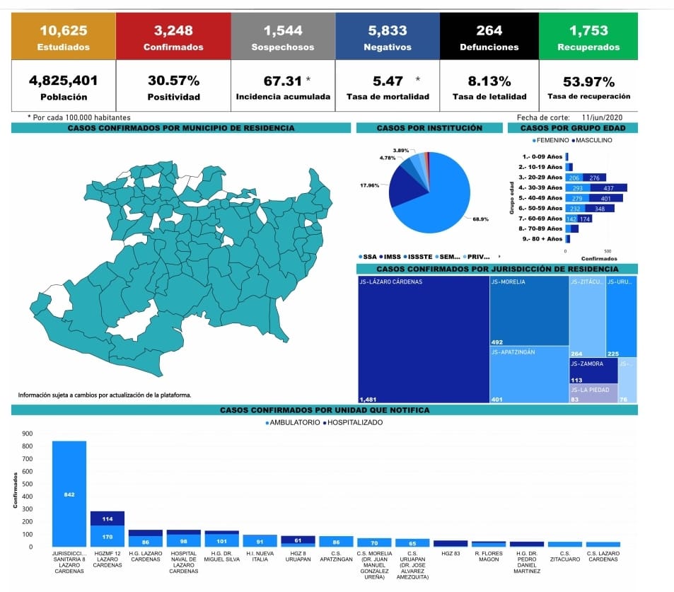Zitácuaro Michoacán. El Comité Estatal de Seguridad en Salud reportó que al día de hoy 264 personas han muerto en Michoacán por COVID-19 y reporta 3248 casos acumulados con reporte positivo de Coronavirus en diferentes municipios, esto es 168 casos nuevos en menos de 24 horas, entre los municipios más afectados se encuentran: LÁZARO CÁRDENAS, MORELIA, APATZINGÁN, URUAPAN Y ZITÁCUARO