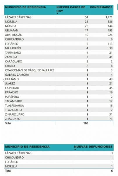 *- Michoacán reporto hoy 6 muertos por COVID-19 y 168 casos positivos en las últimas 24 horas.