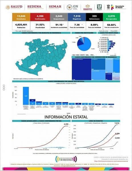 *- Michoacán reporto hoy 13 muertos y 154 casos nuevos por COVID-19, suma 4396 casos positivos y 355 muertos .