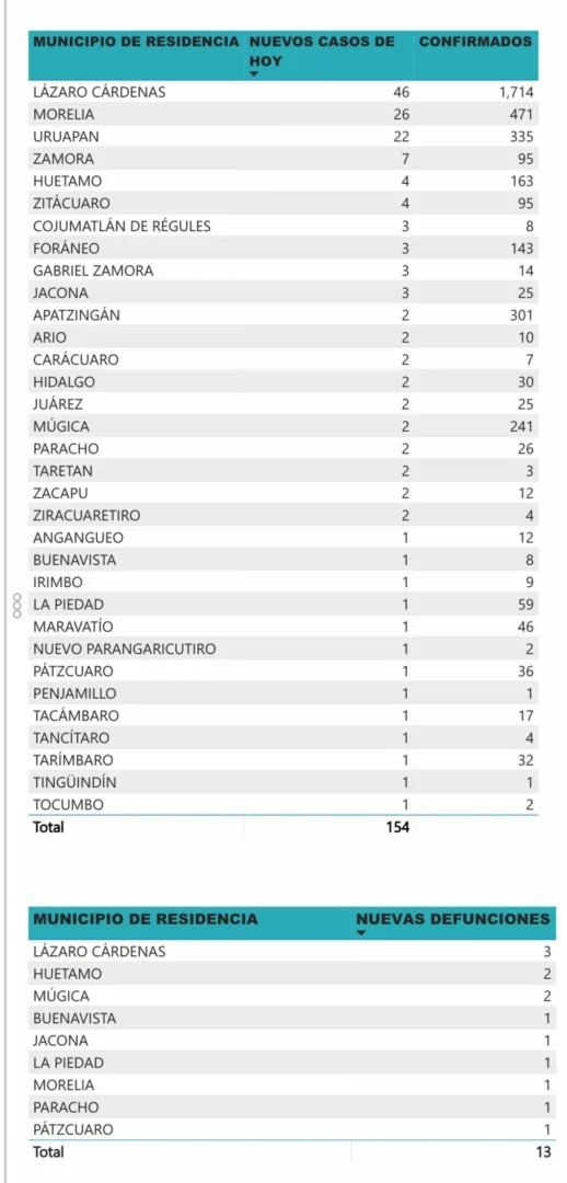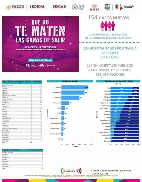 Zitácuaro Michoacán. El Comité Estatal de Seguridad en Salud reportó que al día de hoy 355 personas han muerto en Michoacán por COVID-19 y reporta 4396 casos acumulados con reporte positivo de Coronavirus en diferentes municipios, esto es 154 casos nuevos en menos de 24 horas, entre los municipios más afectados se encuentran: LÁZARO CÁRDENAS, MORELIA, APATZINGÁN, URUAPAN, MÚGICA Y HUETAMO .