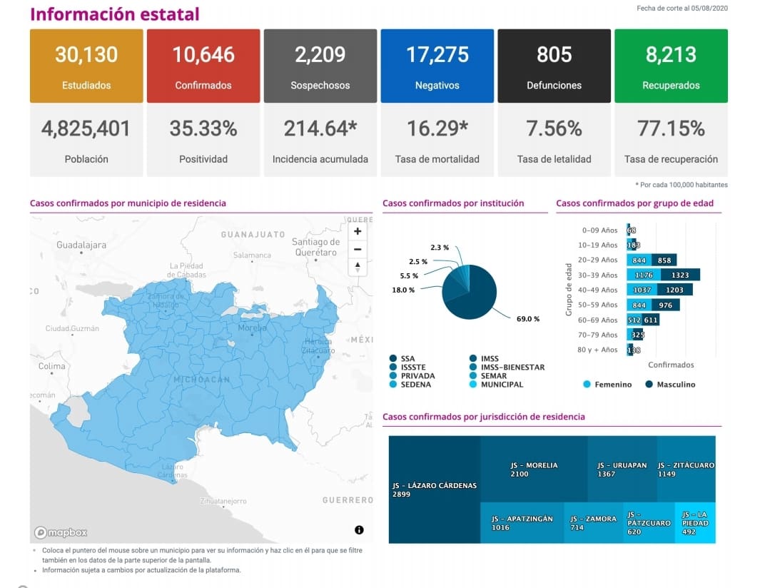 Zitácuaro Michoacán. El Comité Estatal de Seguridad en Salud reportó que al día de hoy 805 personas han muerto en Michoacán por COVID-19 y reporta 10,649 casos acumulados con reporte positivo de Coronavirus en diferentes municipios, esto es 155 casos nuevos en las últimas 24 horas, entre los municipios más afectados se encuentran: