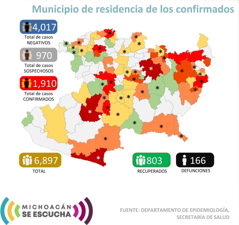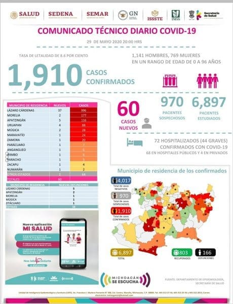 Zitácuaro Michoacán. El Comité Estatal de Seguridad en Salud reportó que al día de hoy 166 personas han muerto en Michoacán por COVID-19 y reporta 1,910 casos acumulados con reporte positivo de Coronavirus en diferentes municipios, esto es 60 casos nuevos en menos de 24 horas, entre los municipios más afectados se encuentran: ÁZARO CÁRDENAS, MORELIA, APATZINGÁN, URUAPAN Y ZITÁCUARO