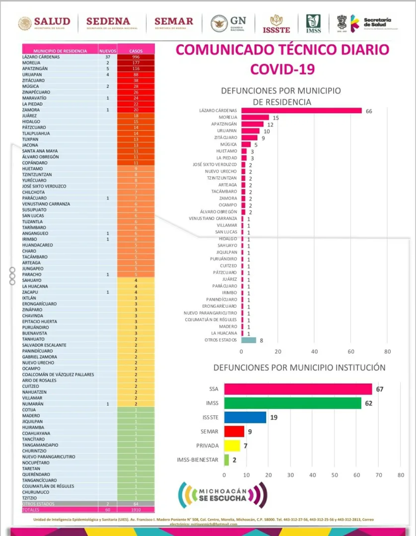 *- Michoacán reportó este día 10 muertos por COVID-19 y 60 casos nuevos en menos de 24 horas.