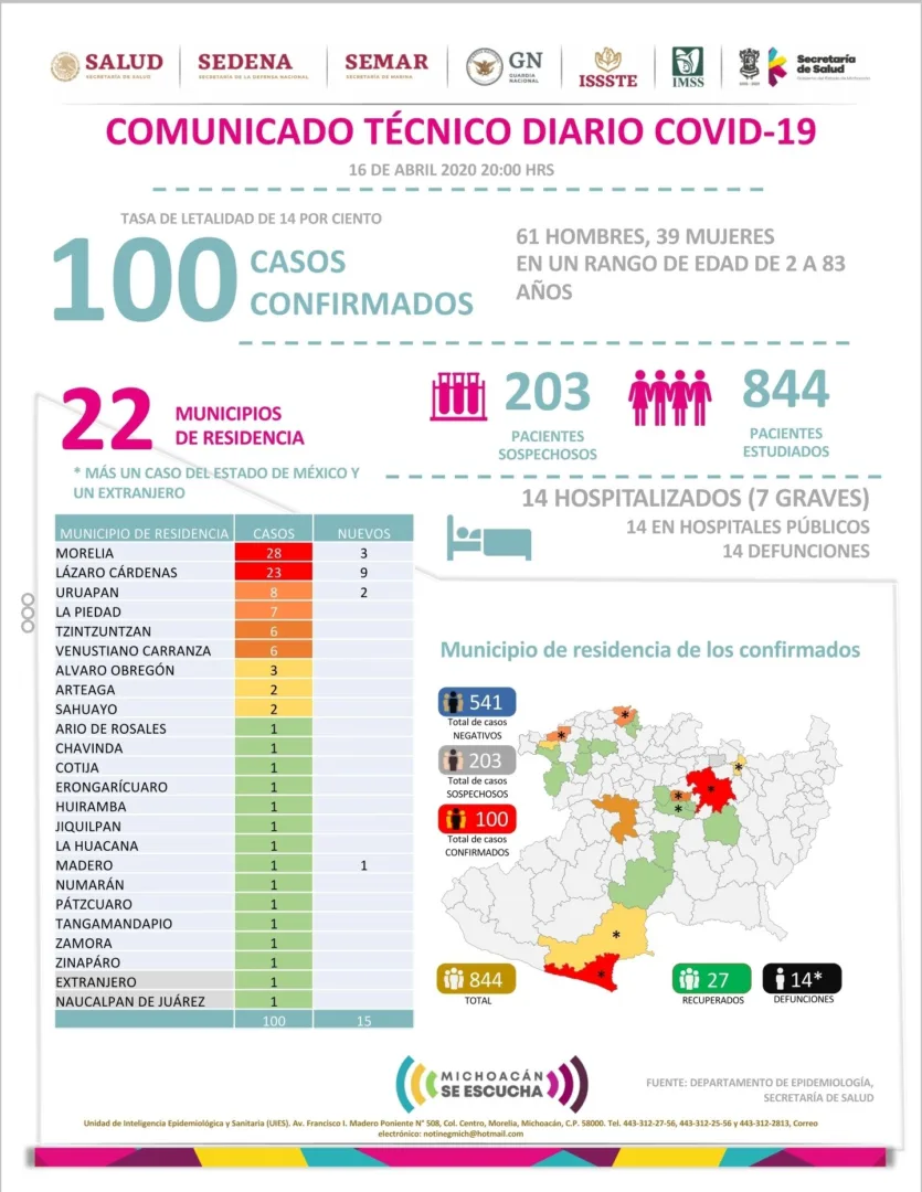 Michoacán suma 14 muertos y 100 casos confirmados por COVID-19